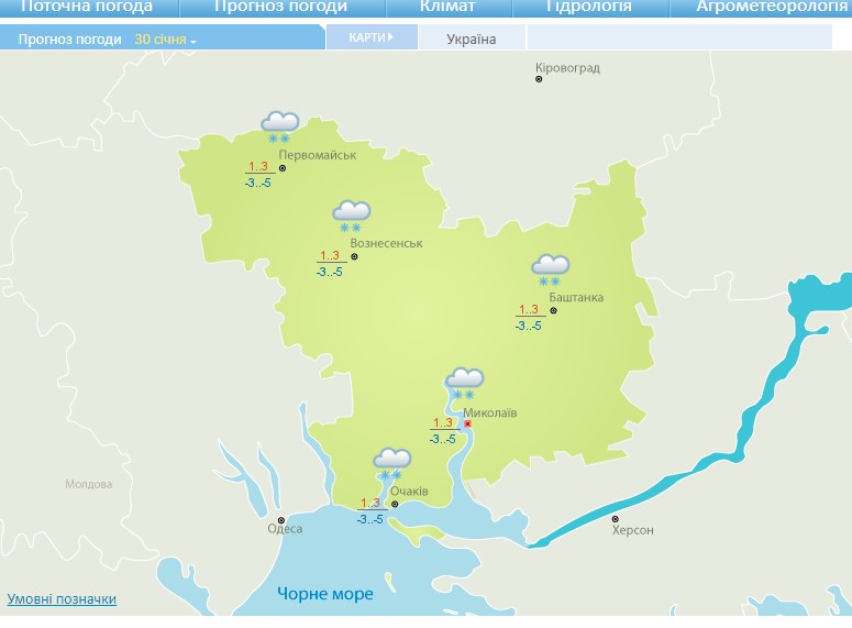 Также 30 января прогнозируют снег, мокрый снег, в западных, ночью и северных областях местами значительный снег, лишь ночью в южных и восточных областях без существенных осадков. Температура 2-7° мороза, днем от 2° мороза до 3° тепла. В Карпатах температура ночью и днем 7-12° мороза.