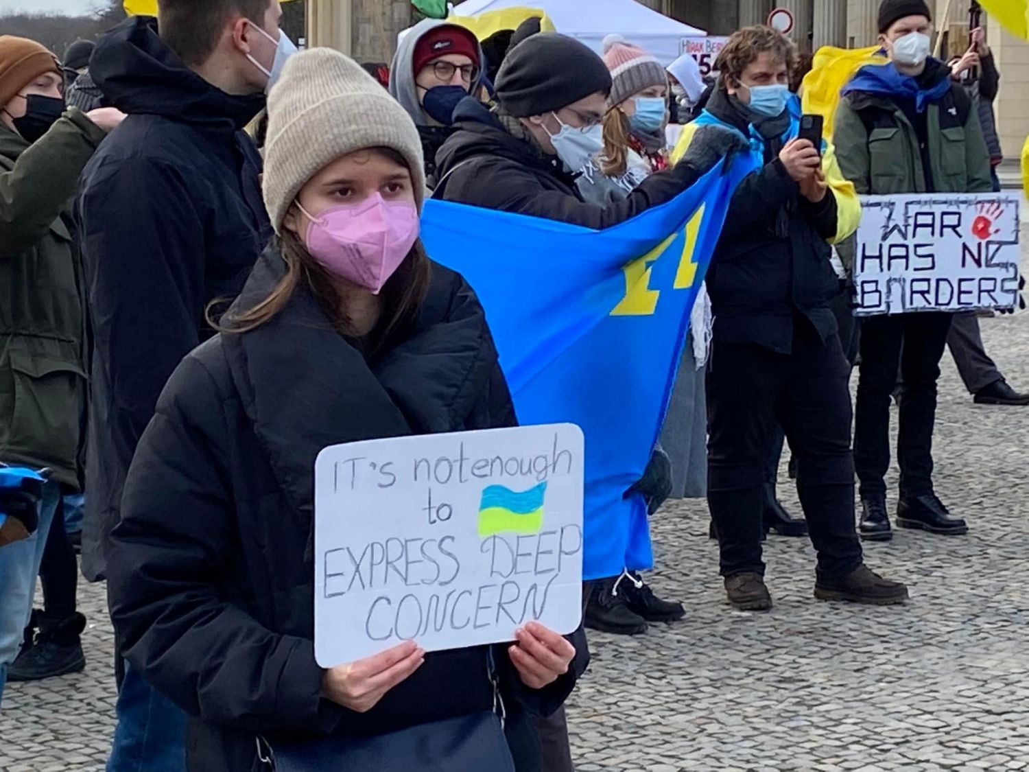 Несколько сотен участников демонстрации махали национальным флагом, а также флагом ФРГ. У митингующих были плакаты с конкретными требованиями: «Руки в крови прочь от Украины», «Путин ответственен за войну в Европе», «Недостаточно проявлять глубокую озабоченность» и «Война не имеет границ».
