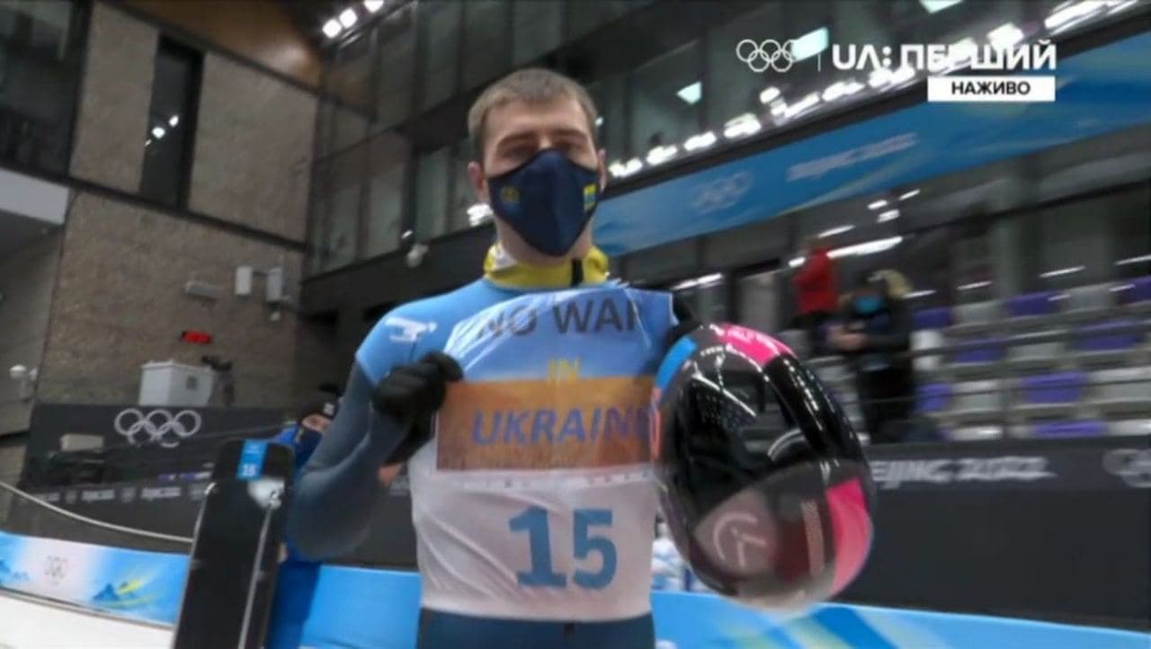 Скелетонист Владислав Гераскевич, представляющий Украину на играх в Пекине, завершил третий забег и воздел вверх антивоенный плакат.