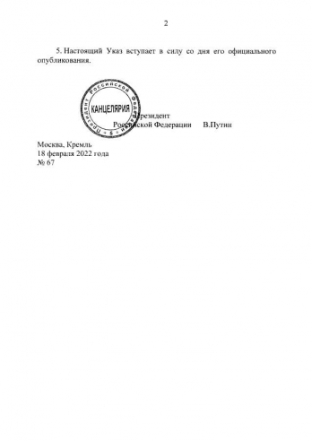Об этом говорится в тексте указа, опубликованном вечером 18 февраля на официальном портале правовой информации.