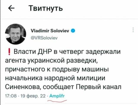 Пост телеведущего федерального «Первого канала» был размещен в Twitter через ресурс для выхода сообщений с задержкой Amplifr и по факту написан за день до взрыва (то есть Соловьев пишет про взрыв и задержание «виновного» 17 февраля, а сам взрыв происходит 18).