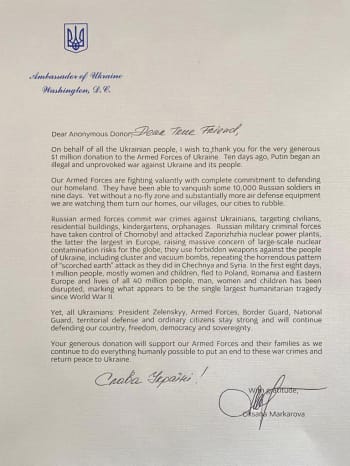 Посол Украины в Соединенных Штатах Америки Оксана Маркарова рассказала о пожертвовании, которое поступило от анонимного донора.