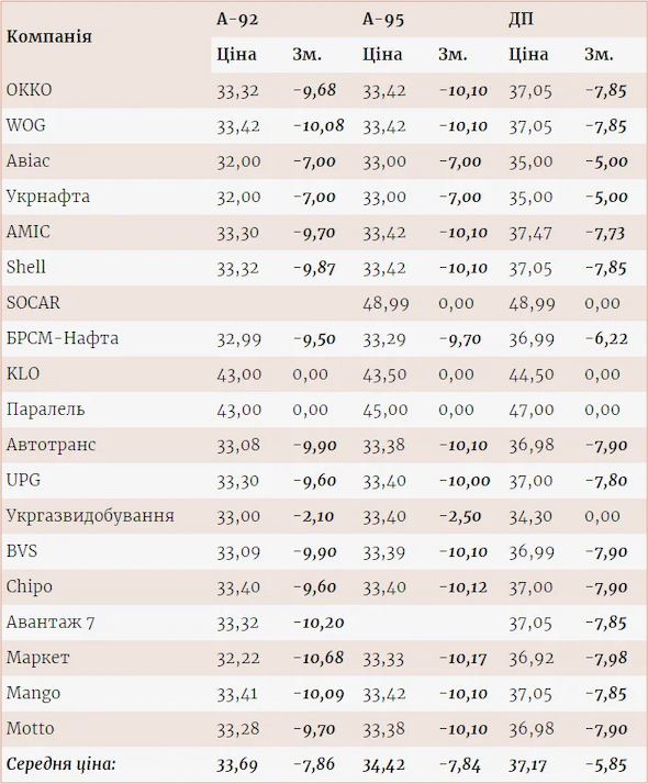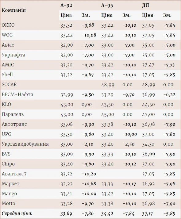 Средняя цена на А-92 по Украине снизилась на 7,86 грн/л, до 33,69 грн/л, на А-95 — на 7,84 грн/л, до 34,42 грн/л, а цена на дизтопливо — до 37,17 грн/л ( -5,85 грн/л).