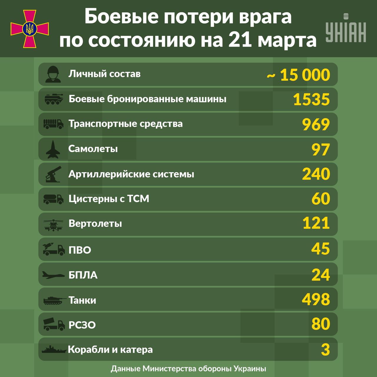 С 24 февраля по 21 марта особые потери российско-оккупационных войск ориентировочно составляют 15 тысяч солдат. Данные уточняются. Подсчет усложняется высокой интенсивностью боевых действий.