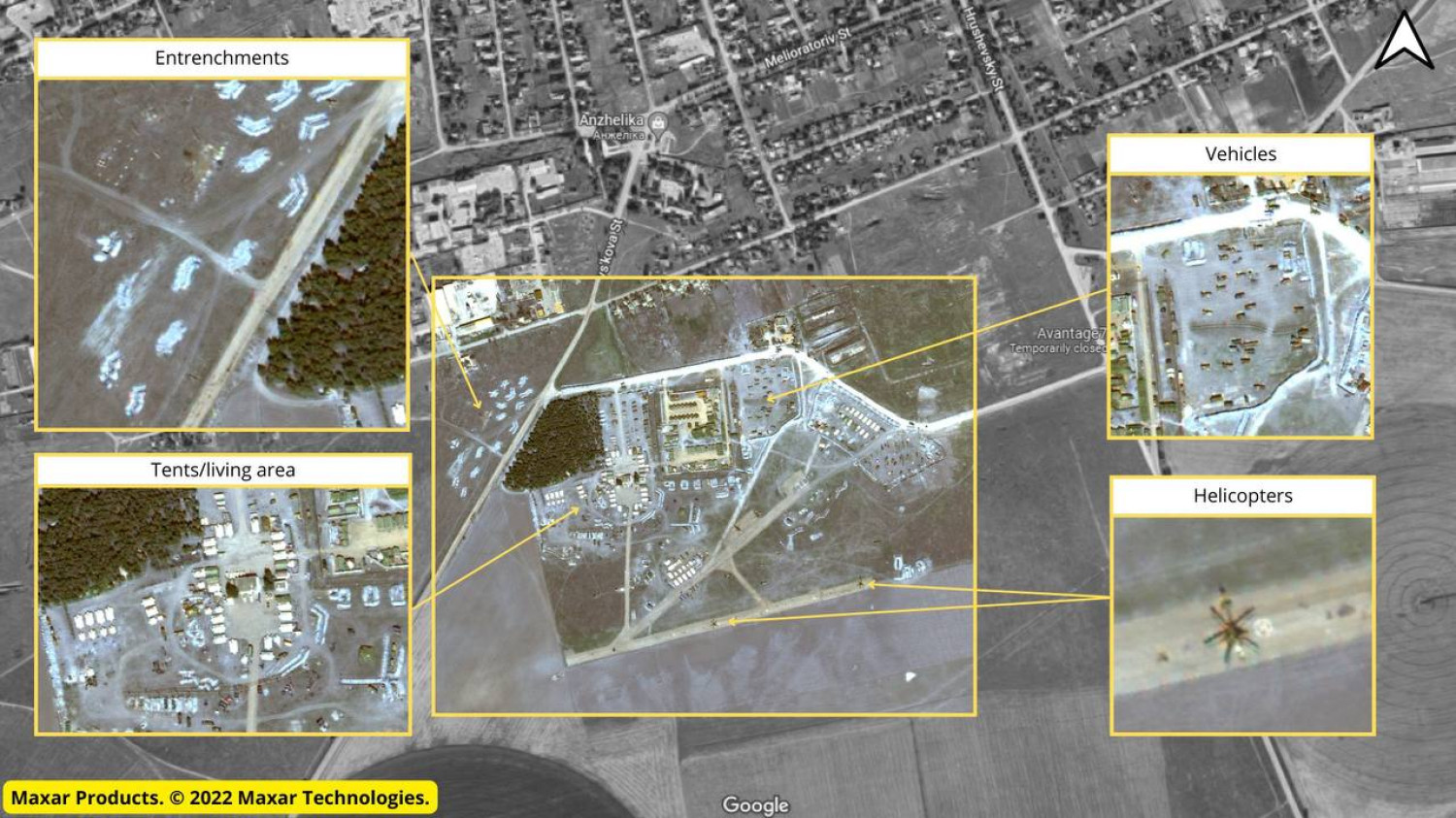 Выбранное место стало сосредоточением российских штабов. Снимки Maxar из космома показывают, что вокруг аэродрома в Чаплынке заметно скопление грузовиков, вертолетов, палаток и инженерных построек.