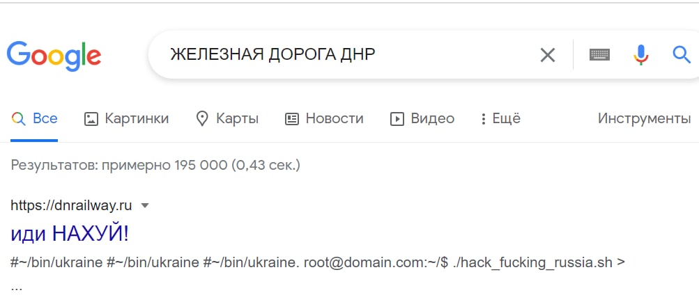 Как пишет «Обозреватель», по запросу «железная дорога «ДНР» поисковик Google первым выдает ее сайт, но вместо обычного названия после взлома он обозначается как «иди НА*УЙ!».