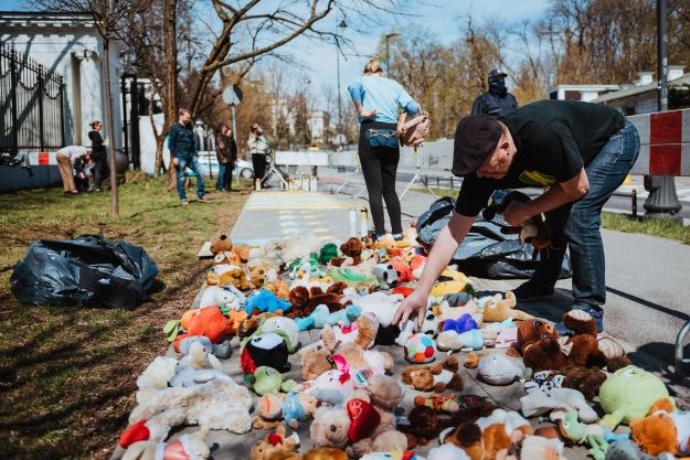 Одна из инсталляций — многочисленные мягкие игрушки, которые могут символизировать пострадавших детей.