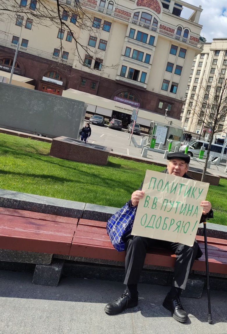 На одном из его плакатов была надпись «Политику В.В. Путина одобряю», на другом — «Одобряю деятельность директора ФСБ РФ».