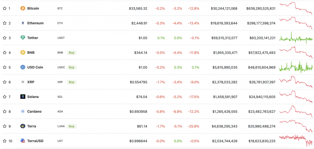 На сайте CoinGecko можем наблюдать, что курс биткоина упал на 3,3% за последние сутки. Восемь из десяти топ-криптовалют показывают отрицательную динамику. Криптовалюты Dogecoin и Binance USD вообще выбыли из топ-10.