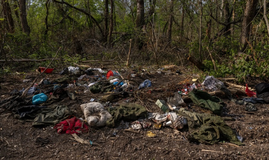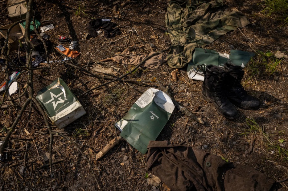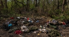 В лесу «с деревьев свисают куски разорванной российской военной формы», местами стоит «невыносимый запах разлагающихся трупов», отметил журналист. Только в одном месте он увидел 15 испепеленных бронетранспортеров.