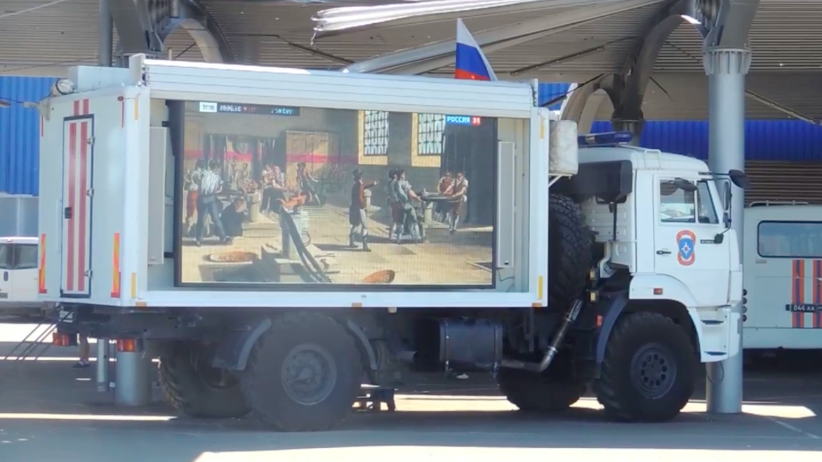 В Мариуполе в пятницу на экранах, закрепленных на грузовиках, показывали псевдоисторические программы о «собирании земель русских».