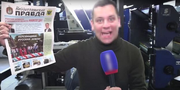 Бумажка с названием «Надднєпрянская правда» и стилистикой любимой в Кремле «Комсомольской правды» рассказывают украинцам в Херсонщине, что Россия якобы установила оккупацию навсегда.