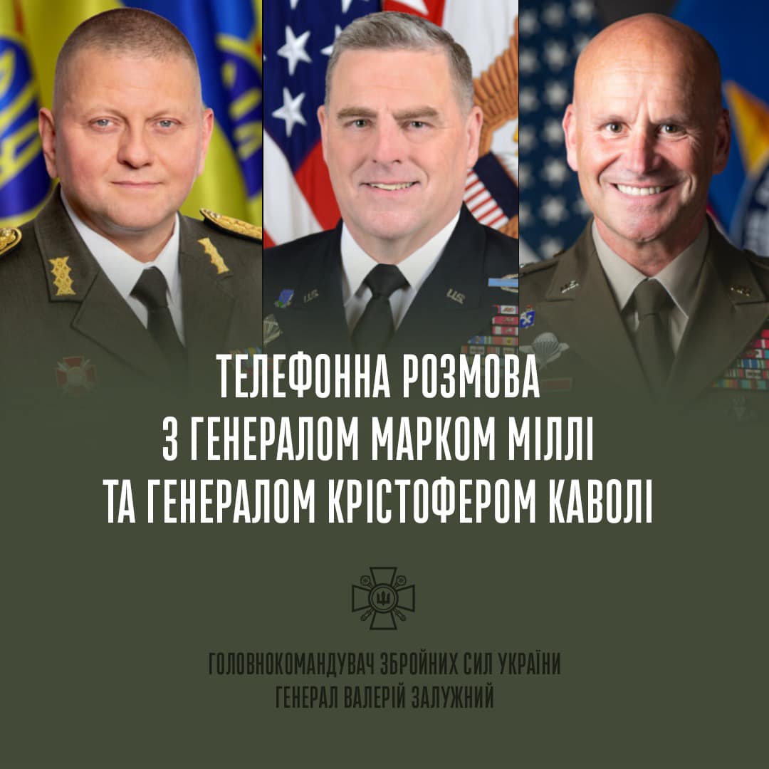 Главнокомандующий Вооруженными силами Украины Валерий Залужный провел телефонные разговоры с верховным главнокомандующим объединенных вооруженных сил НАТО в Европе и командующим ВС США в Европе генералом Кристофером Каволи и председателем объединенного комитета начальников штабов США генералом Марком Милли.