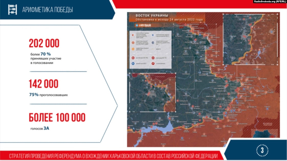 Согласно разработанной в Кремле «Стратегии проведения референдума о вхождении Харьковской области в состав Российской Федерации», «голосование» должно было проходить в течение семи дней с прописанным результатом – 75% за присоединение к стране-агрессору.