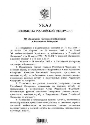 Напомним, что 21 сентября президент РФ Владимир Путин заявил о частичной мобилизации. Мобилизационные мероприятия начнутся сегодня.