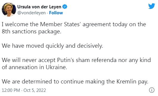 28 сентября Европейская комиссия предложила восьмой пакет санкций против России из-за вторжения в Украину и проведения незаконных референдумов на оккупированных территориях.