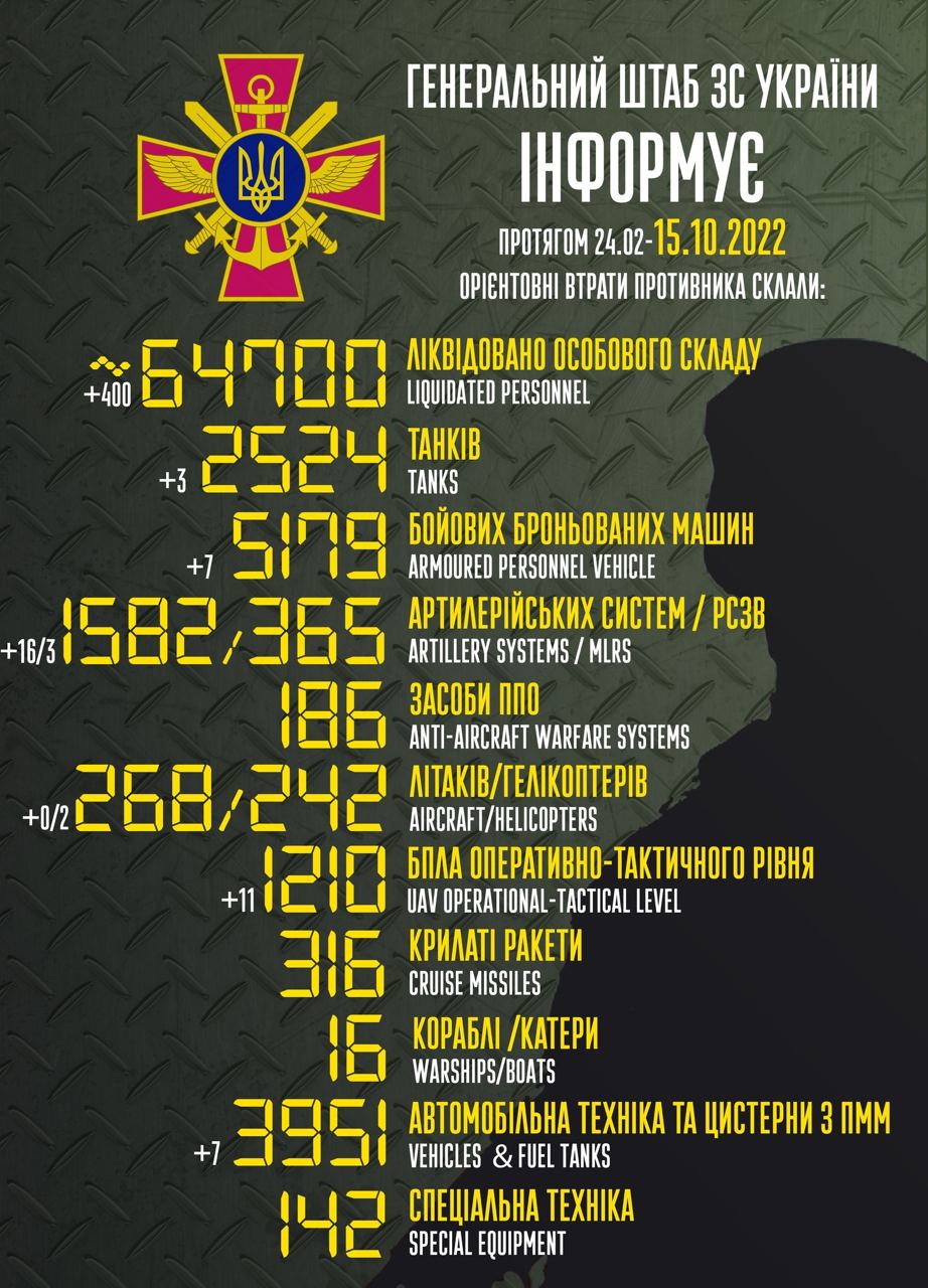 09:33 Загальні бойові втрати противника з 24.02 по 15.10 орієнтовно склали близько 64700 осіб особового складу