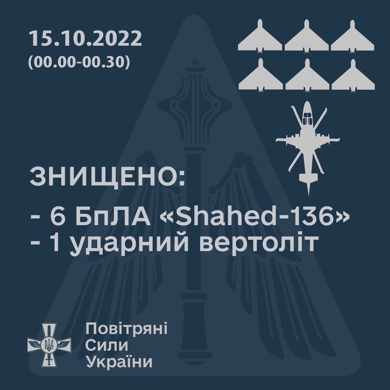 10:00 В ніч з 14 на 15 жовтня українські захисники на сході та півдні знищили шість дронів-камікадзе Shahed-136 та один ударний вертоліт ворога.