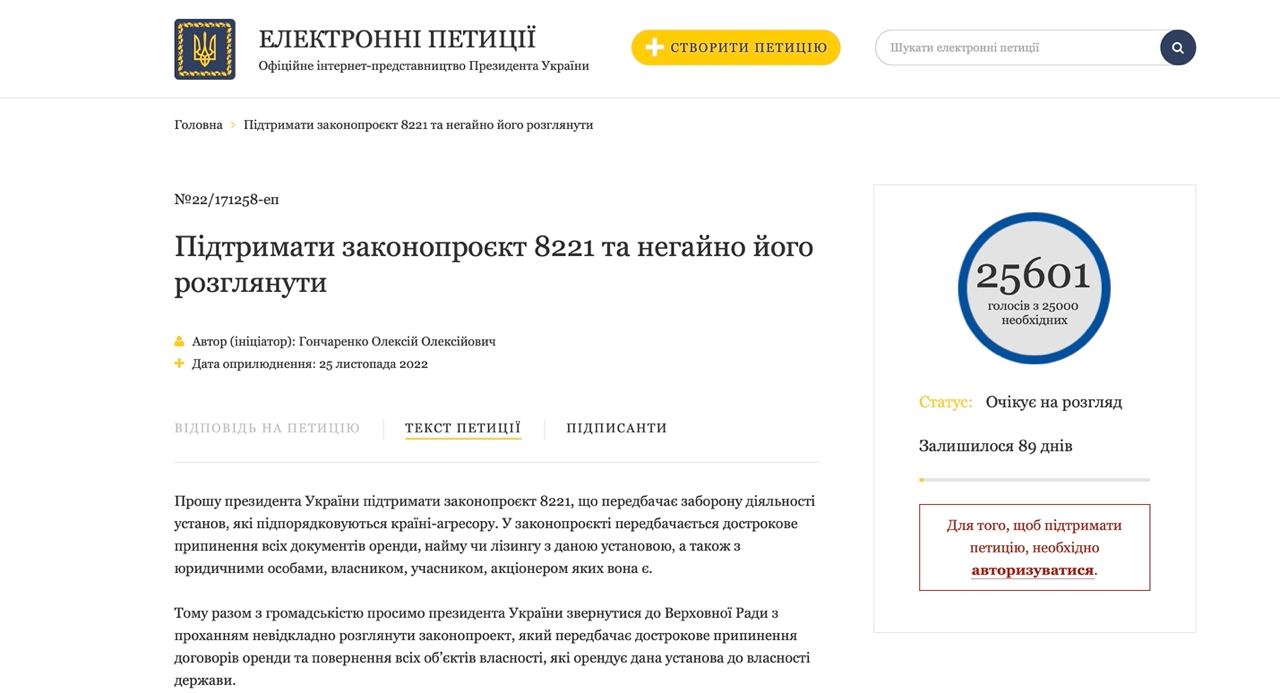 Автор петиции просит президента Зеленского поддержать законопроект 8221, предусматривающий запрет деятельности учреждений, подчиняющихся стране-агрессору.