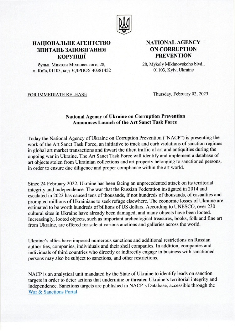 Создание ответственной за это рабочей группы под названием Art Sanct Task Force, которое можно перевести как «Художественная санкционная оперативная группа», анонсировали НАПК и министр Александр Ткаченко в четверг, 2 февраля.