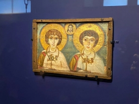 На выставке представлены 5 из 16 произведений, привезенных во Францию: четыре энкаустических иконы на дереве VI и VII веков и константинопольская микромозаическая икона конца XIII — начала XIV веков, украшенная исключительным золотарным обрамлением.