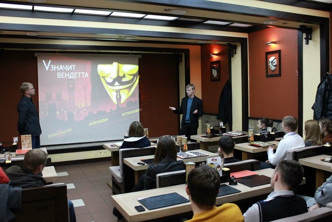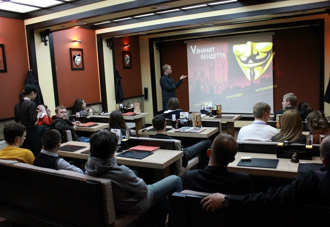 Гости мероприятия обсуждали представленную экранизацию романа Алана Мура по сценарию братьев Вачовски – фильм в жанре антиутопии «V – значит вендетта».