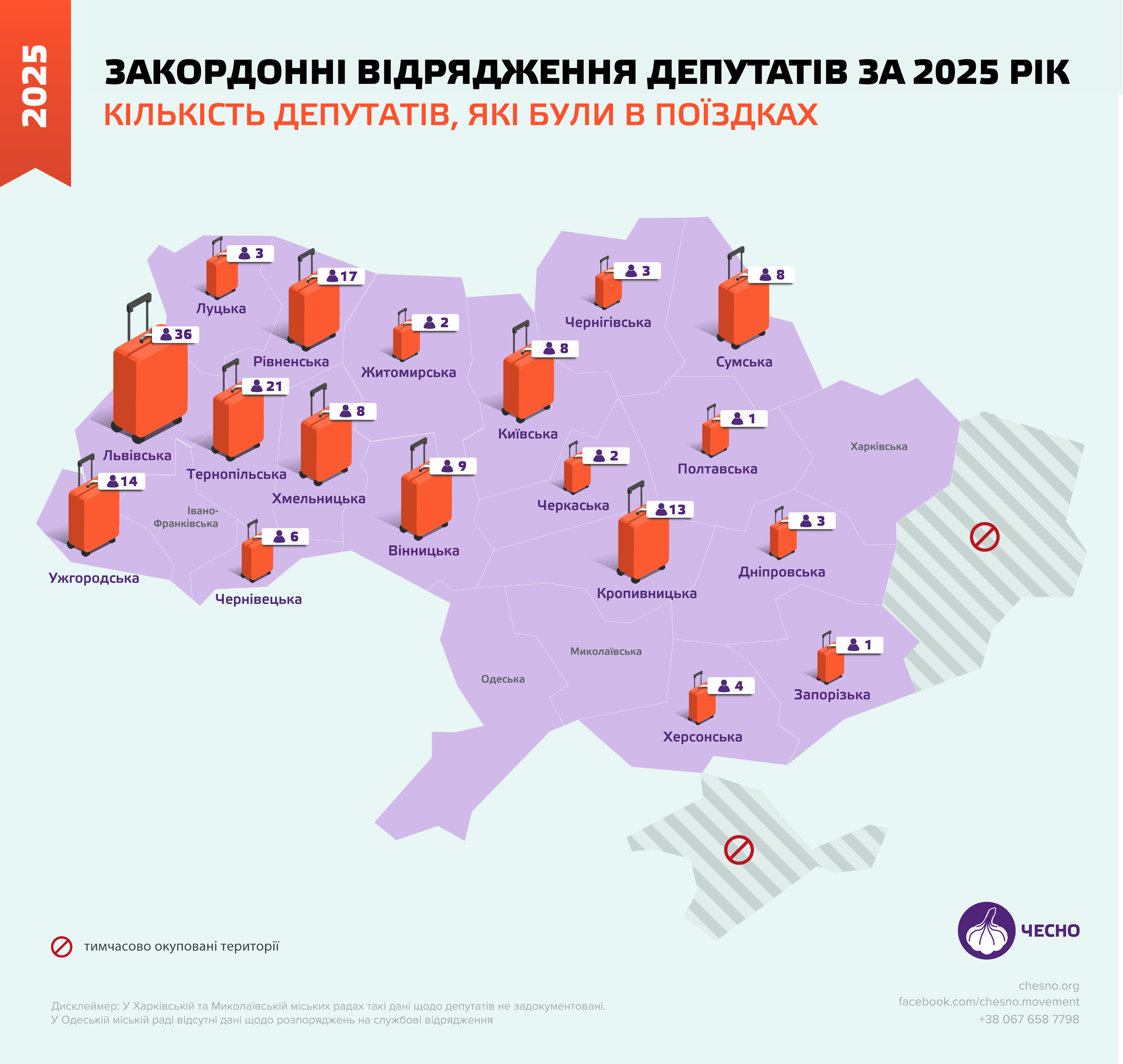 Для сравнения, во Львовском горсовете за границу выезжали 36 депутатов — это самый высокий показатель среди всех проанализированных советов. Из бюджета на поездки выделили более 1,4 миллиона гривен.