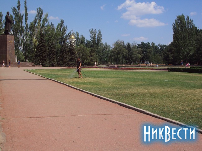 В то время, пока зеленые зоны становятся все больше похожими на каменные джунгли, газон на площади Ленина никто не вытаптывает и он выглядит ухоженым. А вот про площадку возле здания городского совета такого сказать нельзя.