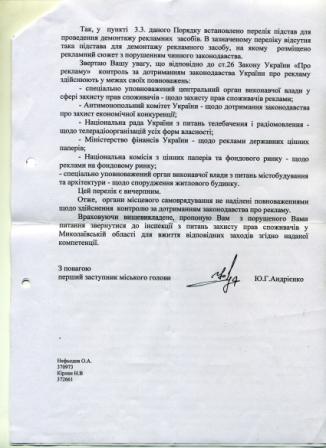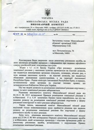 По словам заместителя председателя областной организации УНП Алексея Мирошниченко, на его обращение, адресованное городскому голове Владимиру Чайке относительно размещенных в Николаеве с нарушением действующего законодательства Украины агитационных материалов о предоставлении официального статуса русскому языку поступил официальный ответ за подписью первого зама городского головы Юрия Андриенко.
