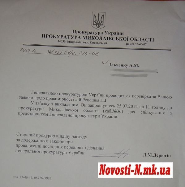 Во вторник, 24 июля, Анатолий Ильченко получил приглашение на встречу с представителей Генеральной прокуратуры Украины. Так, в приглашении говорится, что Генпрокуратурой проводится проверка по заявлению Ильченко относительно правомерности действий П. Репешко. В связи с этим пенсионера попросили 25 июля прийти в прокуратуру Николаевской области.