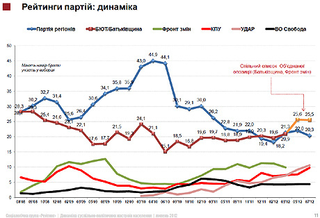Если бы выборы в Верховную Раду были в июле 2012 года, победу получила бы Объединенная оппозиция в составе партий «Батьківщина», «Фронт Змін» и Гражданская позиция.