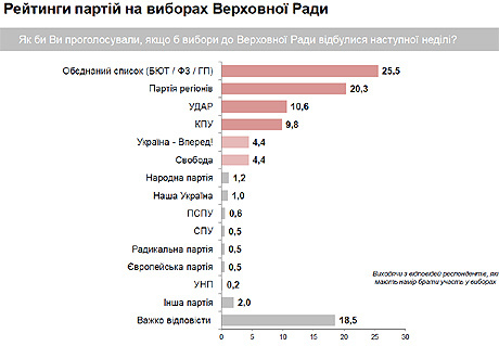 Среди них 25,5% опрошенных проголосовали бы за единый список оппозиции, 20,3% - за Партию регионов, 10,6% - за партию УДАР Кличко, 9,8% - за Коммунистическую партию, по 4,4% - за Свободу и партию Королевской "Украина - Вперед!".