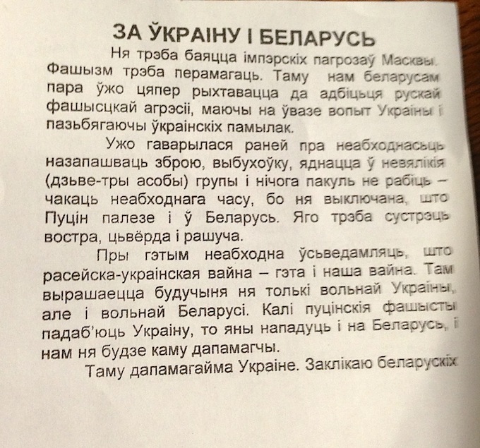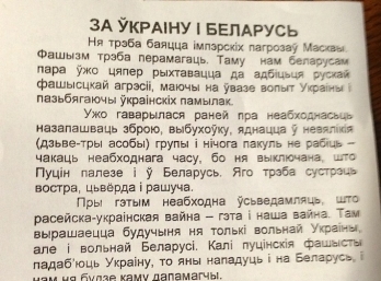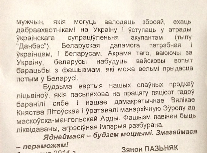 В листовке сказано, что российско-украинская война – это и белорусская война. Там решается судьба не только свободной Украины, но и Беларуси. Позняк призывает белорусов помогать украинцам, ехать добровольцами и вступать в батальоны.