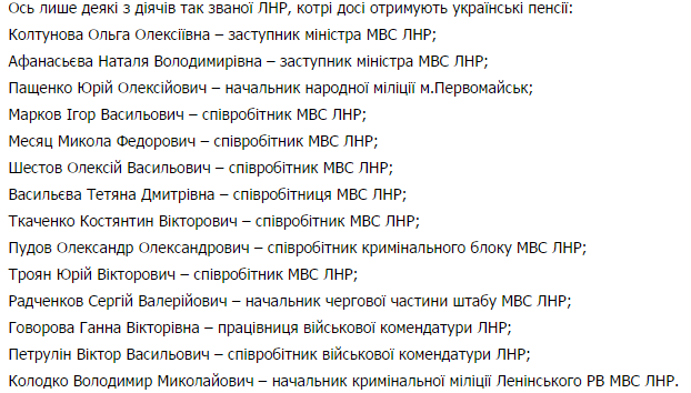 В сообщении на своем сайте председатель Луганской ОГА привел 14 фамилий «чиновников» группировки «ЛНР», которых якобы дальше финансирует Украина. В то же время Москаль добавил, что «на самом деле их гораздо больше».