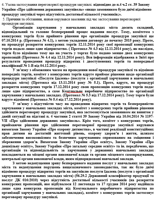 – В связи с отсутствием времени на проведение открытых торгов и непрерывностью питания в учебных заведениях города, комитет по конкурсным торгам принял решение осуществить переговорную процедуру закупки, которая применяется заказчиком в порядке исключения в данной ситуации на основании п. 4 части 2 статьи 39 Закона Украины от 10.04.2014 № 1197-VII «Об осуществлении государственных закупок». Кроме того, комитет по конкурсным торгам, принимая решение об осуществлении переговорной процедуры закупки, руководствовался требованиями Закона Украины «Об охране детства», в части реализации конституционных прав ребенка на достаточный жизненный уровень, охрану здоровья и жизни, путем обеспечения высококачественным и безопасным питанием, направленным на укрепление и сохранение здоровья. Требованиями Закона Украины «Об образовании», Закона Украины «О дошкольном образовании», Закона Украины «Об общем среднем образовании» и др. предусмотрено, что организация и ответственность за питание в государственных учебных заведениях возлагаются на местные органы исполнительной власти и органы местного самоуправления, центральные органы исполнительной власти, которым подчинены учебные заведения, - говорится в сообщении.