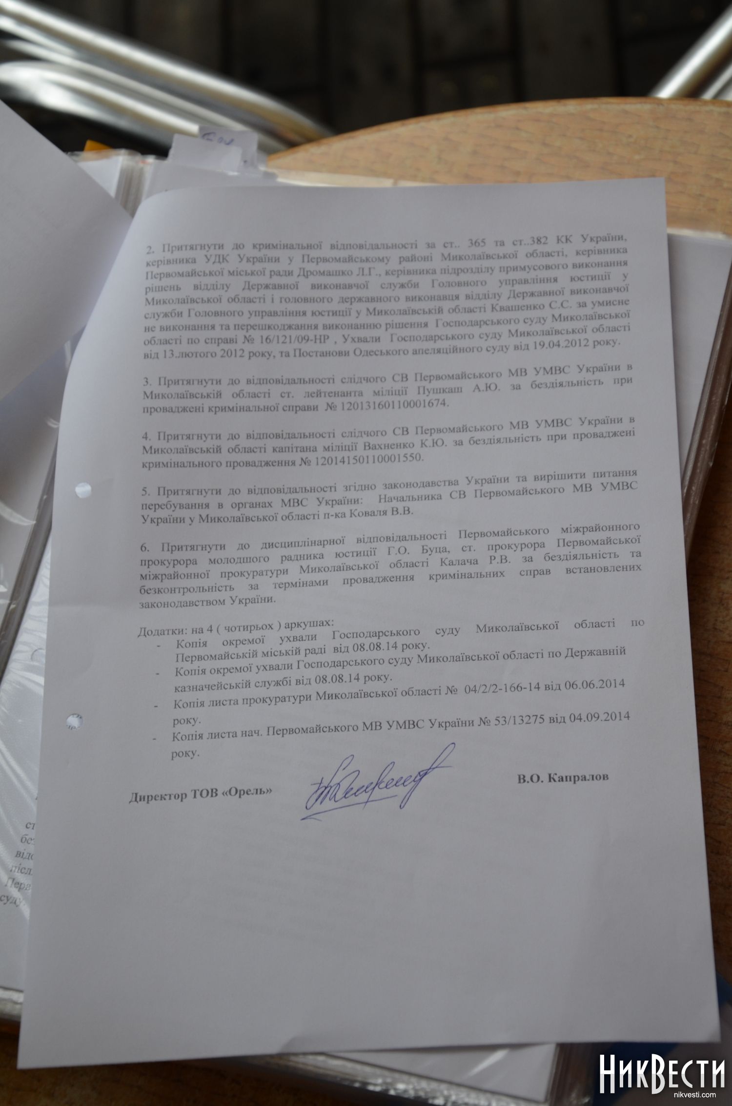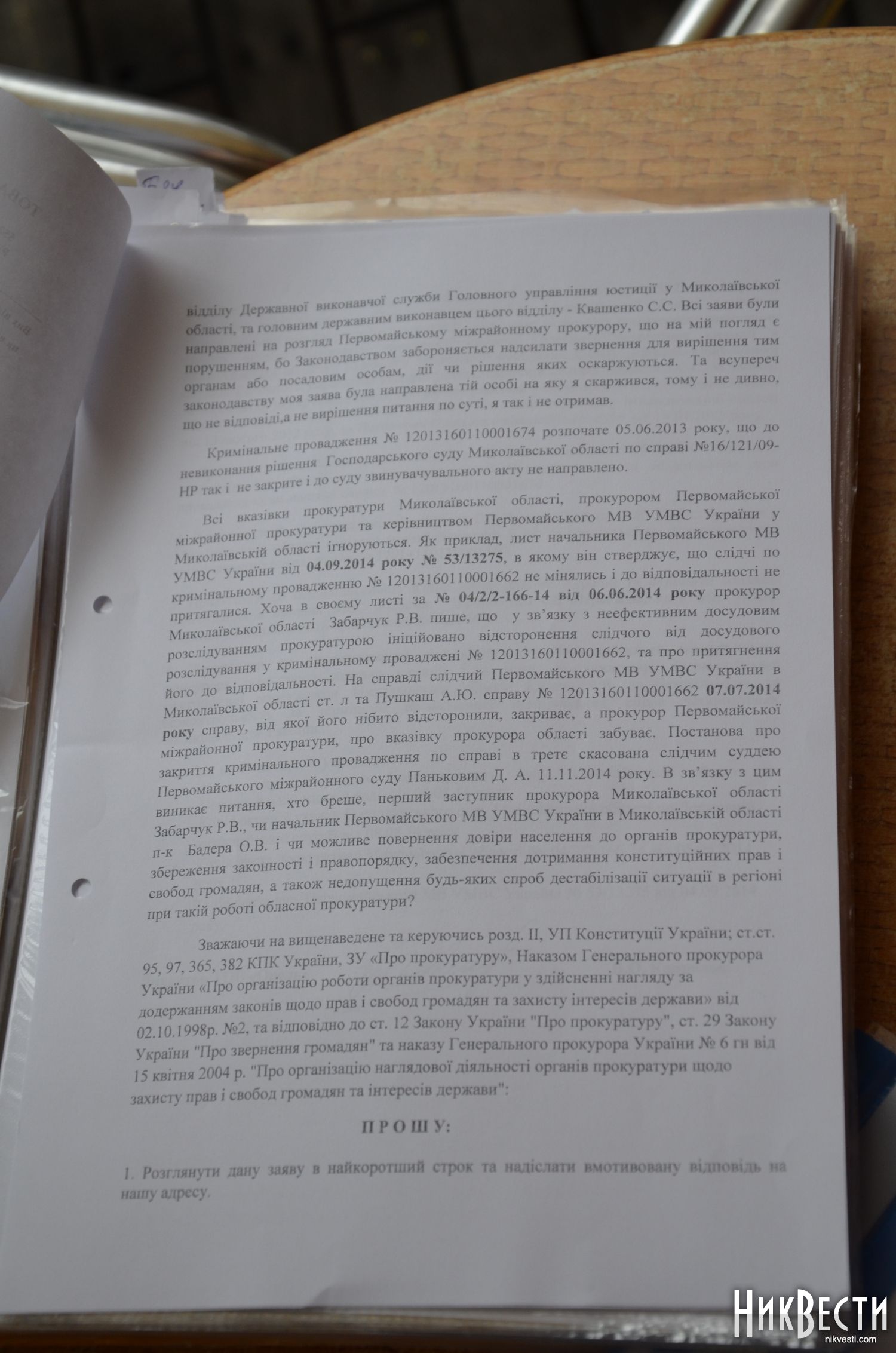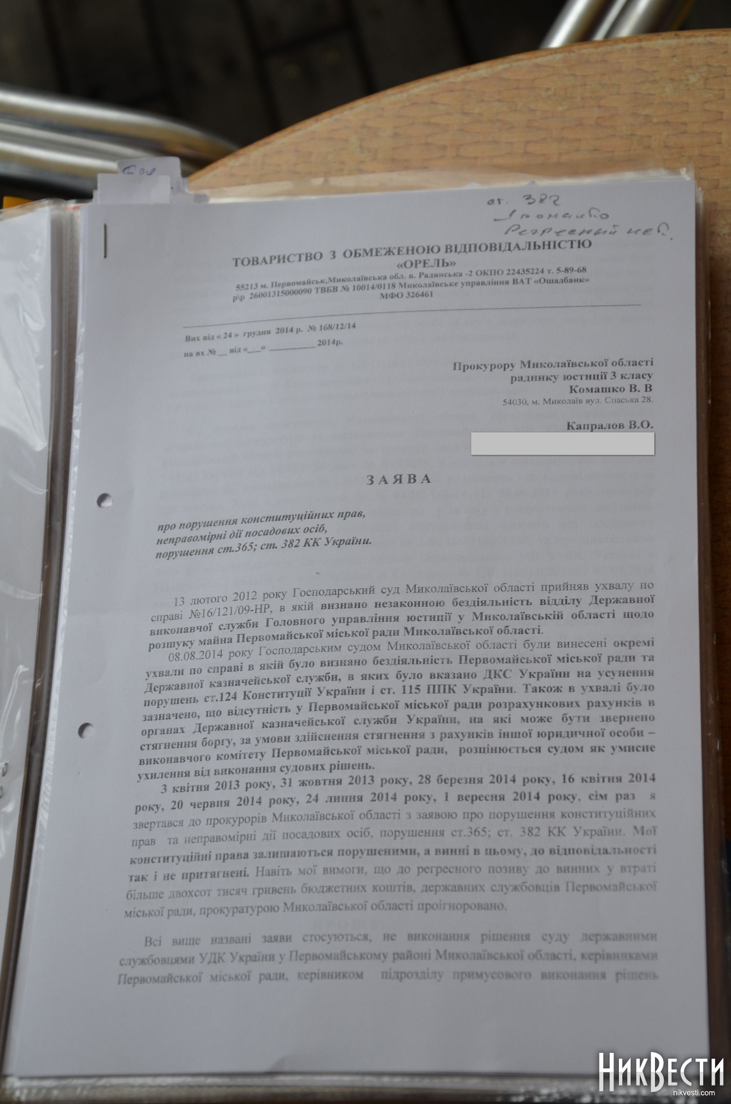 Еще 17 января 2011 года общественник получил решение Хозяйственного суда Николаевской области о взыскании с Первомайского городского совета 144 тысячи гривен из-за служебной халатности одного из работников. Данное решение передали в исполнительную службу, в которой оно пролежало без выполнения 2,5 года, сказал активист.
