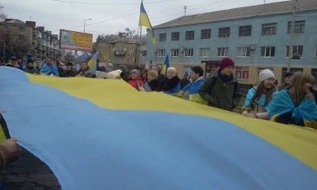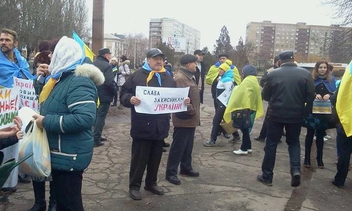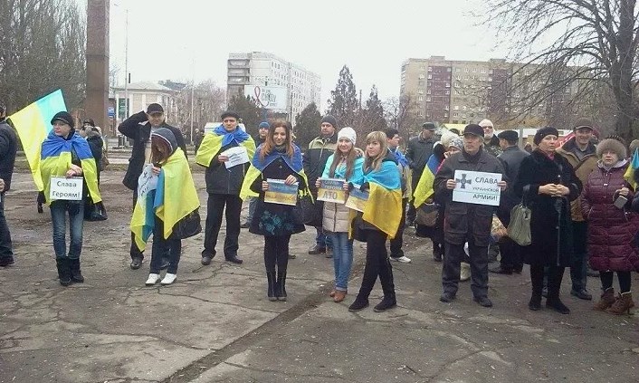 Люди держат в руках флаги Украины и плакаты, на которых написано «Слава Украине», «Слава героям АТО!», «На фронт ушли самые достойные! Возвращайтесь живыми», «А деды-то воевали».