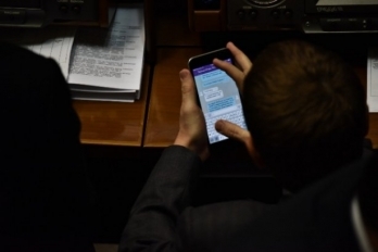 Корреспондент, сделавший фото, отметил, что Виталий Хомутынник прикрывал телефон, набирая смс, однако в какой-то момент отвлекся, благодаря чему удалось сфотографировать переписку.