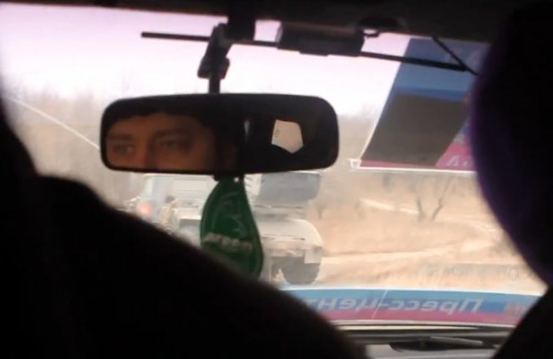 В конце видеоролика «журналист» садится в автомобиль, на лобовом стекле которого наклейка с флагом «ЛНР» и надпись «пресс-центр».