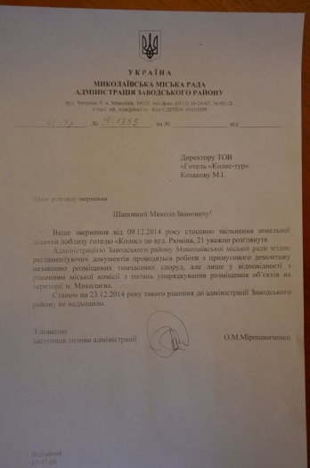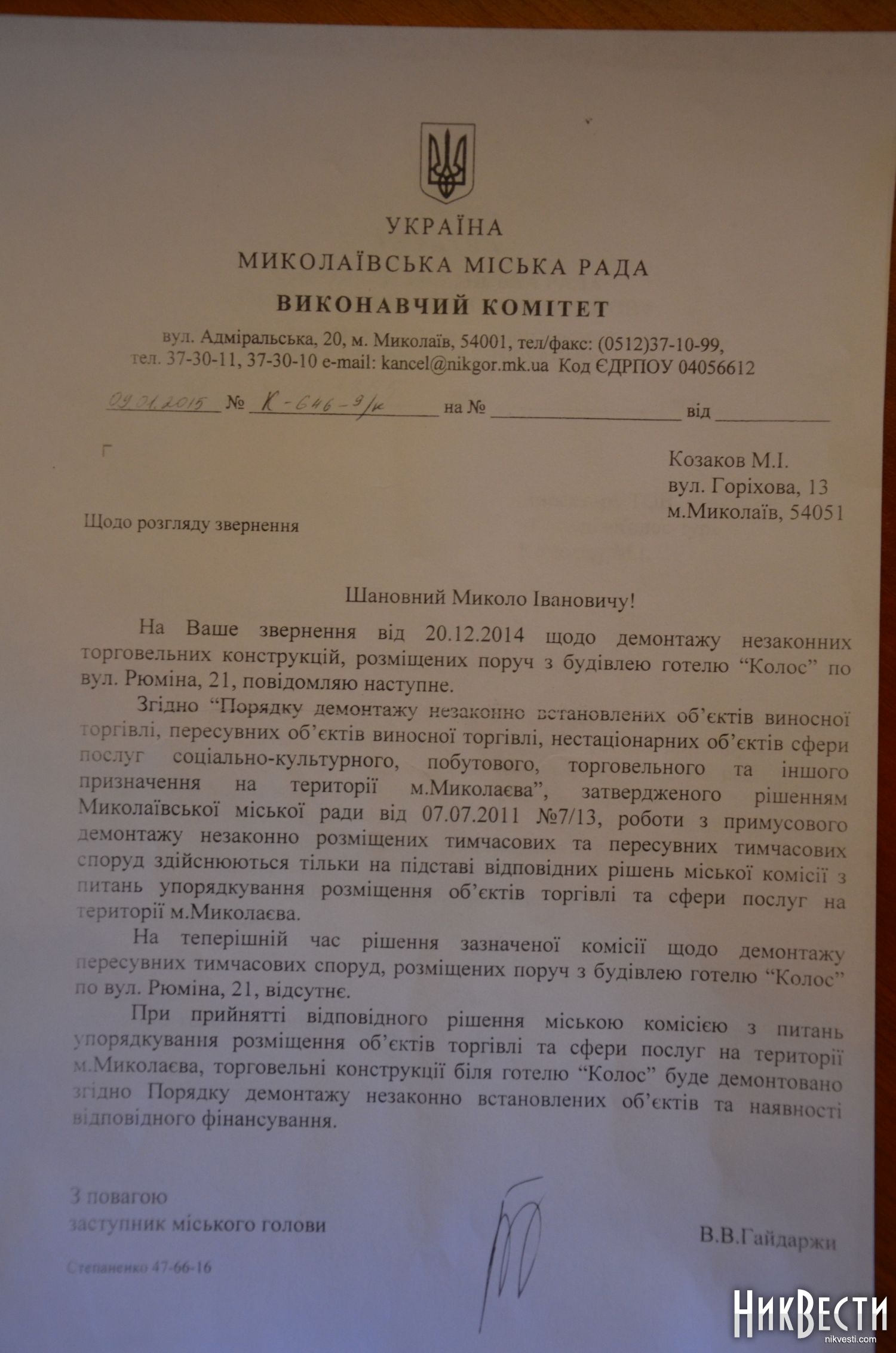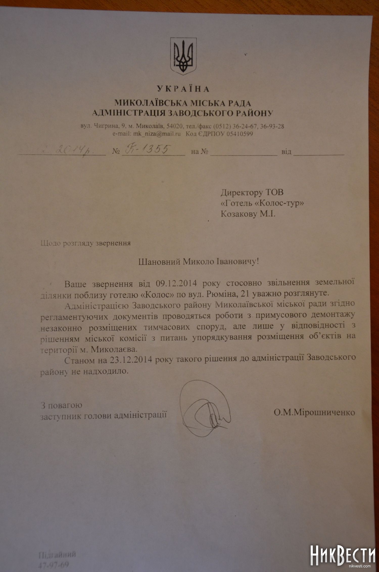 Напомним, что николаевские журналисты рассказали, как размещение киосков на улице Рюмина, в том числе и перед гостиницей «Колос», не прямо, но контролируется городской прокуратурой под руководством Юрия Палия.