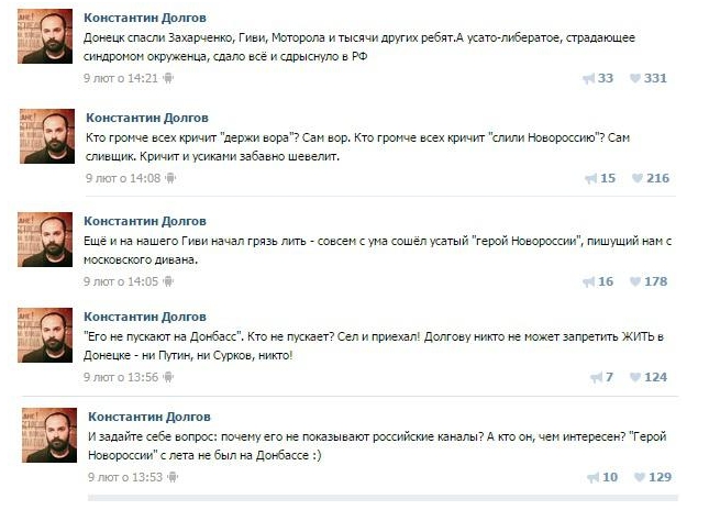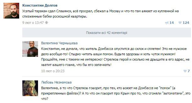 «Усатый таракан сдал Славянск, все просрал, сбежал в Москву и что-то там вякает из купленной на сп ***ные бабки роскошной квартиры», - написал Долгов о Гиркине в соцсети.