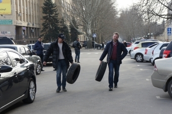 Протестующие представились водителями, они принесли с собой две покрышки и бампер, - передает корреспондент НикВестей.