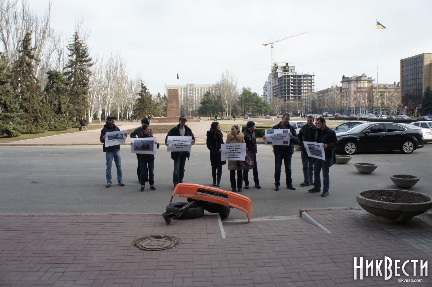 Сегодня, 25 февраля, десять человек организовали акцию протеста под стенами Николаевского городского совета с требованиями начать ремонт дорог.