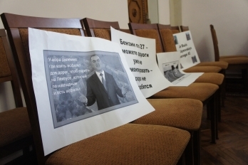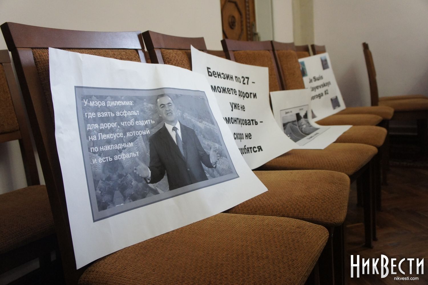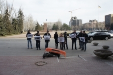 Сначала их акция была на грани срыва – один из организаторов принес несколько плакатов и заявил, что митинг не начнется, пока «количество людей не превысит количество плакатов». Вместо своего мероприятия они начали фотографировать себя и журналистов. Когда «кворум» собрался, один из участников собрания раздал пришедшим листы бумаги с надписями: «Мы не хотим иметь аномальные дороги», «Бензин по 27 – можете дороги уже не ремонтировать – скоро не понадобятся», а также плакаты с фотографиями колдобин на дорогах.