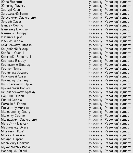 — За гражданское мужество, патриотизм, отстаивание конституционных основ демократии, прав и свобод человека, активную благотворительную, гуманистическую, общественную деятельность в Украине, самоотверженное служение украинскому народу, проявленные во время Революции достоинства (ноябрь 2013 года - февраль 2014), других событий, связанных с защитой независимости, суверенитета и территориальной целостности Украины, - говорится в мотивирующей части распоряжения.