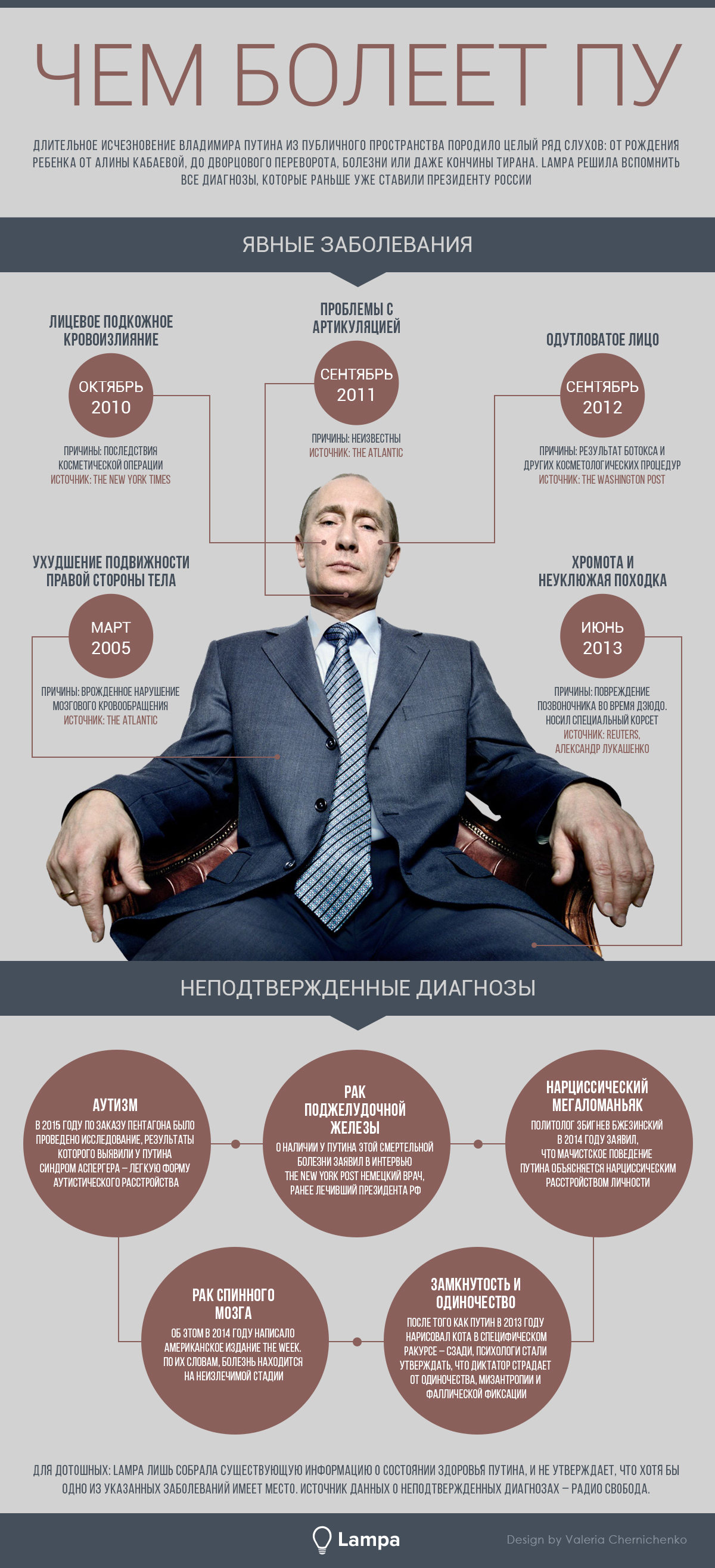 В инфографике указаны все болезни, о которых упоминали СМИ с марта 2005 года. Кроме того, журналисты подытожили неподтвержденные диагнозы российского лидера.