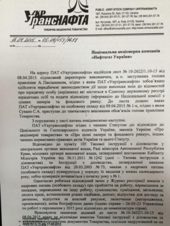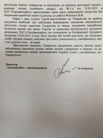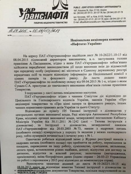 В данном письме «Укртранснафта» утверждает, что Сергей Сукало не прибыл в центральный офис «Укртранснафты» и не предоставил необходимых документов для осуществления своих полномочий.