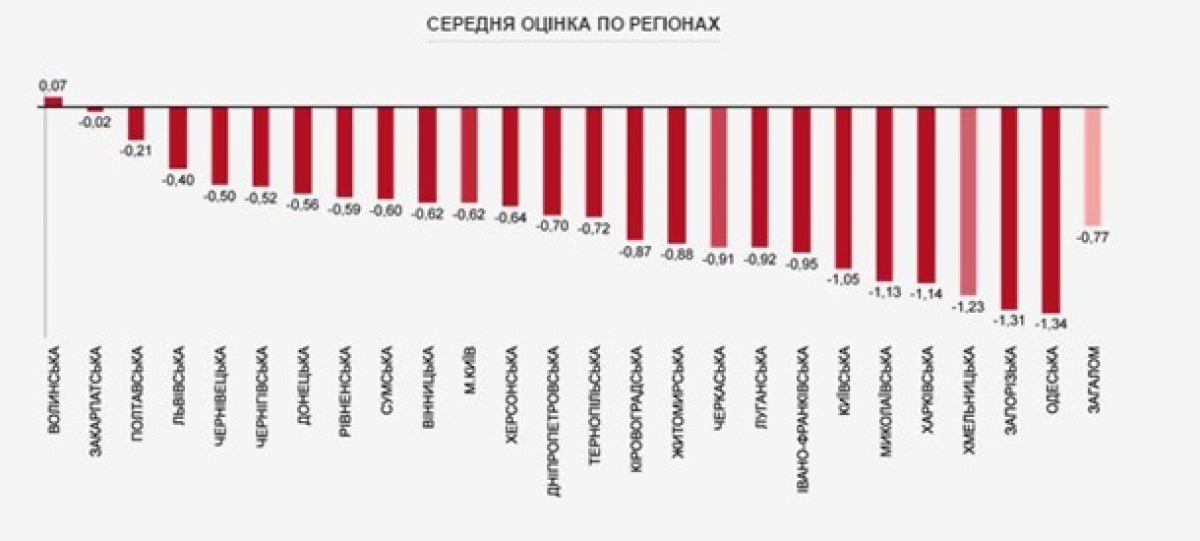 Самыми коррумпированными регионами оказались Одесская, Запорожская и Хмельницкая области. Наименьше взяток заметили в Волынской, Закарпатской и Полтавской областях. Николаевская область занимает пятую позицию в рейтинге самых коррумпированных регионов.