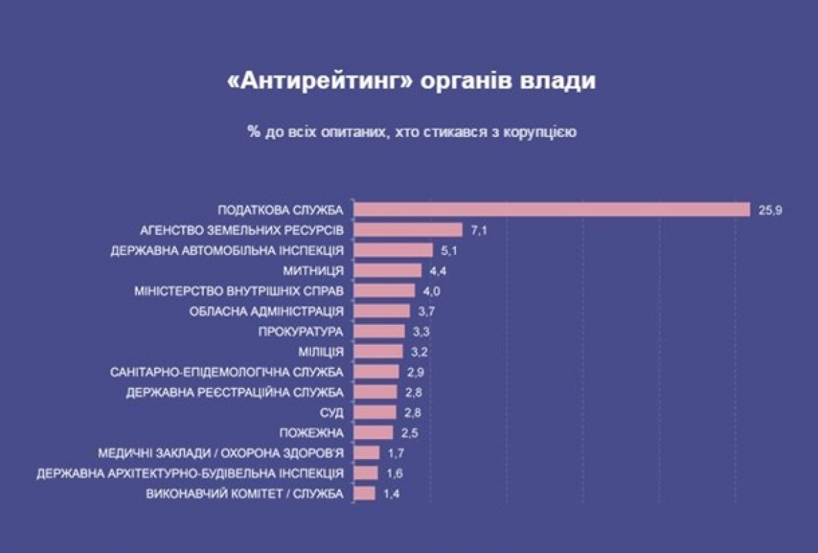 По итогам исследования, также в перечень наиболее коррумпированных госорганов попали таможня (4%), Министерство внутренних дел (4%), областные администрации (3,7%), прокуратура (3,7%), милиция (3,2%), санитарно-эпидемиологическая служба (2,9%), Государственная регистрационная служба (2,8%), суды (2,8%), пожарная служба (2,5%), медицинские учреждения (1,7%), Государственная архитектурно-строительная инспекция (1,6%), горисполкомы (1,4%).