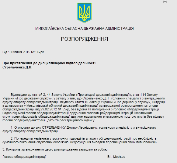 Главный специалист по внутреннему аудиту аппарата Николаевской облгосадминистрации Дмитрий Стрельченко давал поручения председателям райгосадминистраций и руководителям структурных подразделений ОГА от имени губернатора Вадима Мерикова без его ведома и согласования.